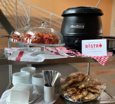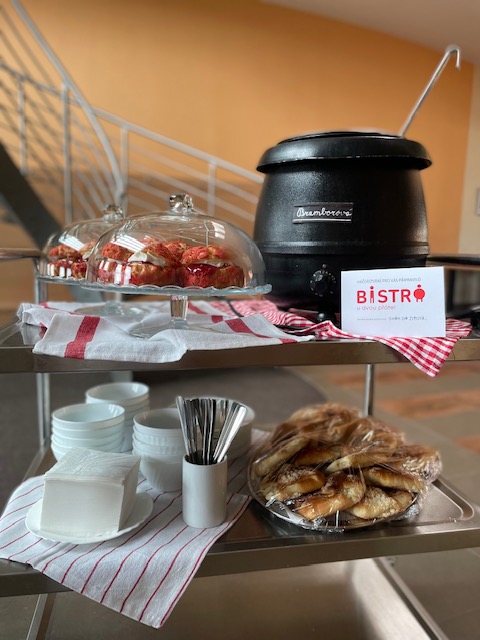 BISTRO u dvou přátel je součástí služeb SKOKu do života, které jsou koncipovány tak, aby dospělí lidé s intelektovým znevýhodněním nebo duševním onemocněním měli možnost získat pracovní návyky a dovednosti pro samostatný život. Získat dlouhodobé pracovní uplatnění, najít si bydlení a s trvalou podporou žít v místě a městě, které mají rádi. Přátelský tým BISTRA u dvou přátel tvoří pracovníci se zdravotním znevýhodněním, pracovní asistenti, kuchaři. Jednotlivé pracovní pozice jsou uzpůsobeny dle individuálních potřeb pracovníků tak, aby na nich byli dlouhodobě samostatní, úspěšní a spokojení. Výsledkem pak jsou kvalitní a čerstvé produkty. Poskytujeme náhradní plnění. Denně vaříme 4 druhy obědů z kvalitních surovin, na kterých si u nás můžete pochutnat do 10 minut (v čase od 11 do 14 hodin). Od 7 do 15 hodin jsme Vám připraveni servírovat kávu, domácí limonády, zákusky, či obložené pečivo z rodinné pekárny. Nabízíme catering (s obsluhou i bez) od chlebíčků, croissantů, baget, řízečků a dezertů až po kávu, džusy a (ne)alko drinky! Naše prostory jsou ideální pro firemní večírky či menší svatby dle přání.Další zajímavé informace