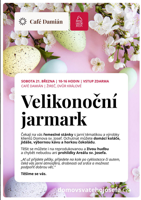 Café Damián v Areálu sv. Josefa se na jeden den promění v místo plné jarní atmosféry, tvořivosti a radosti ze setkávání 🌸🐣 Návštěvníci se mohou těšit na řemeslné stánky s jarní a velikonoční tématikou a také na výrobky klientů Domova sv. Josefa 💛